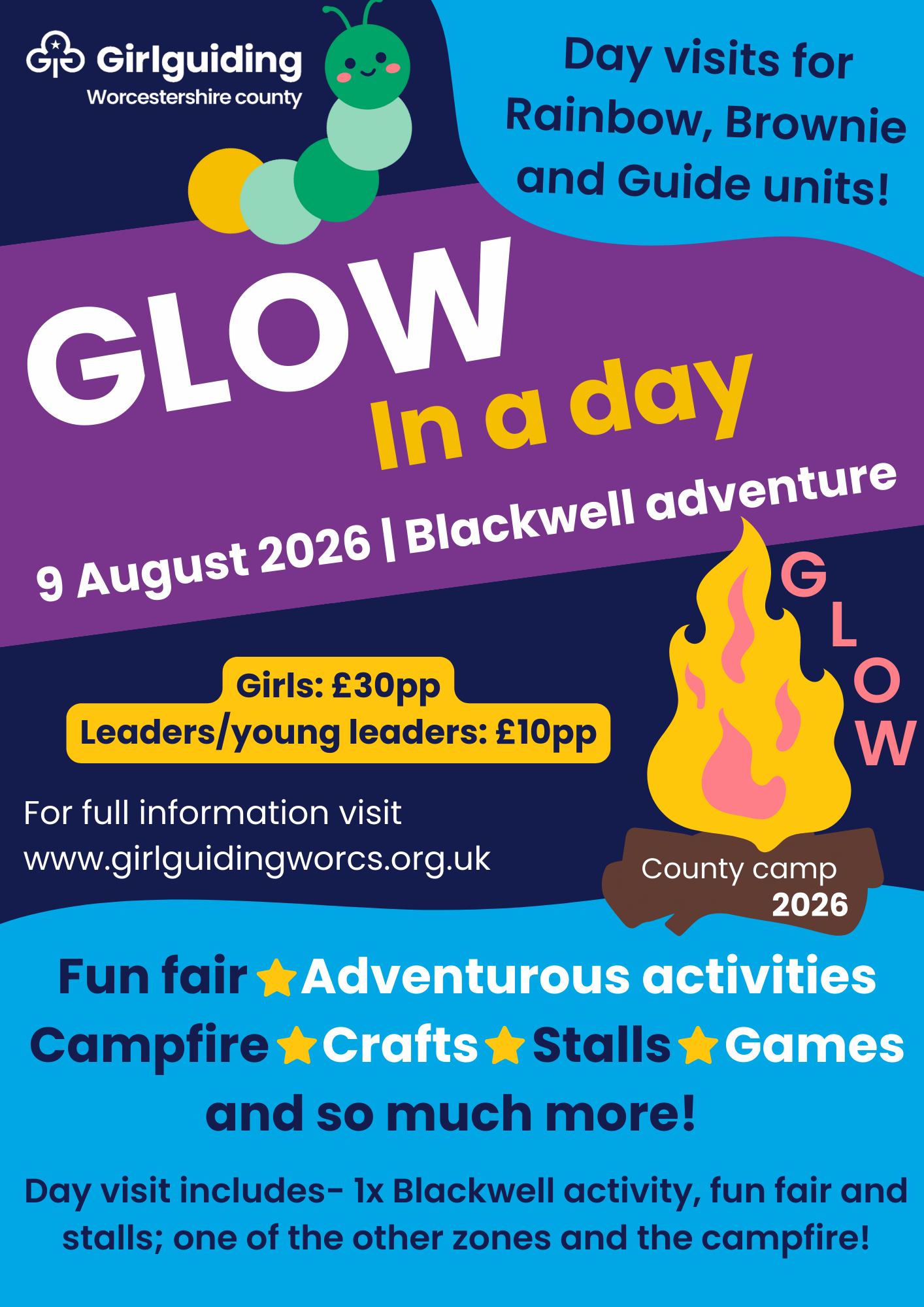 A payment form will be sent to you after registration to return to glow@girlguidingworcs.org.uk with details of what you are paying for.  FINAL NUMBERS required by 30 April 2026.